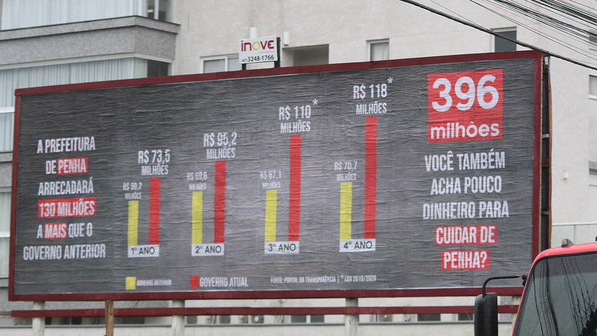 O Notícias de Penha confirmou os dados do outdoor no Portal da Transparência. A mensagem fixada na propaganda questiona se os R$ 396 milhões que a prefeitura arrecadará ao final de quatro anos é “pouco dinheiro para cuidar da cidade”.