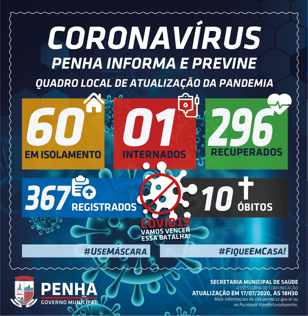 A Secretaria de Saúde de Penha também confirmou 10 novos casos positivos de covid-19, além de mais 08 pacientes recuperados. Os novos casos são de 04 moradores de Armação, 2 do Centro, 02 de São Cristóvão, 01 de Nossa Senhora de Fátima e 01 da Cohab. Ainda restam 32 casos suspeitos aguardando resultado de exames pelo Laboratório Central de Saúde Pública de Santa Catarina (Lacen).
