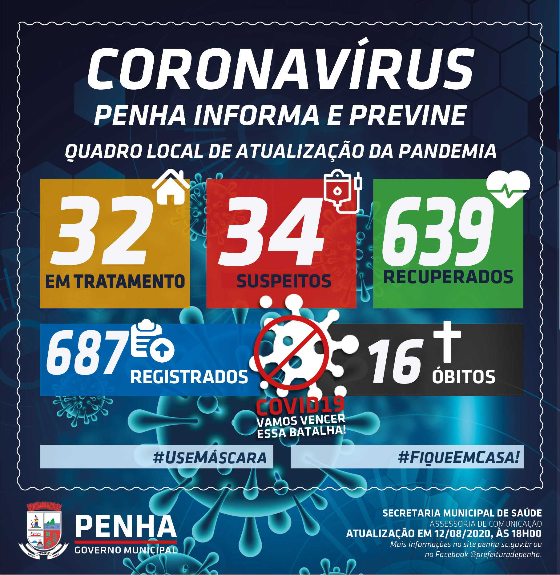 Até agora já foram registrados 687 casos de covid-19 em Penha, com 639 pacientes recuperados, e 16 tendo vindo a óbito. Além dos 32 pacientes confirmados atualmente com a doença, outros 34 casos suspeitos (que aguardam resultado de exames do LACEN – Laboratório Central de Saúde Pública de Santa Catarina) também fazem tratamento e mantém isolamento social, seja em casa ou nos hospitais da região.