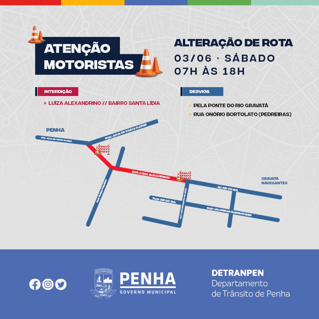 Na manhã deste sábado (03), o Departamento de Trânsito de Penha (DetranPen), vai bloquear o tráfego de veículos na Rua Luíza Alexandrino (na altura da Rua Theotônia Ana de Jesus), no bairro Santa Lídia, para a realização de obras no local, limitando o acesso apenas para moradores durante o período entre 07h e 18h. O desvio poderá ser feito pela Ponte do Rio Gravatá ou pela Rua Onório Bortolato, popularmente conhecida como Pedreiras.